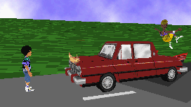 The way this movie is animated is unique. Chris and Will have come up with a character animation method that still uses the basic actions for walking and movement but basically doubled the speed, or the ground covered, so characters move insanely fast even in the 'Walk' action and the movie thus never gets boring between transitions. This is bound to be labeled as an exclusive animation method copyright in effect to the two talented directors. Blood and guts are shown with the classic squashed explosion splatter effect which they also decided to speed up more than other directors would have which works well and fits in with the feel. The star character Gustave somersaults all over the shop in every scene, and usually beats, shoots or stabs anyone he passes in the street. Its silly, and that is why it is so funny. Its silly, and it hardly ever gets boring. When it does though its a little bad, like listening to Johnny talking about something for a couple hundred frames (who isn't particularly amusing in the last part of the movie). Or when Gustave is threatening to kill someone before he inevitably does. But then this gives some other parts of the movie more impact, like when you think Jack is going to talk to Gustave for ages, but then Gustave slaps him and continues on. Other instances of pure stupid comedy is the way thay Gustave goes into the bars toilets and pisses all over the place and just laughs. You really have to see this to believe it. Cobra was funny as well, he is the guy who gets killed in the quote of the movie under the pictures to the left. I was tempted to put a more longer quote in concerning Cobras name and the way he talks like he always uses a CB radio with the start and end transmission clicks. Why? Why have such a stupid thing in a movie? Because its real funny. Watch it and see. I particularly like the way Chris and Will went out of their way to get good audio. Wav recoded midis, wav songs, voice clarity and most of all the little things, like the way that before the disco scenes down a corridor before the main disco the music sounds more distorted then when the action gets to the disco. Not many directors go that far. The death sounds are funny too. Chris and Will stick with the same characters over and over and use the same death sounds. My favorite is the 'eh mon EEEEH!!!!!' blokes death which is coincidently a cry of 'eh mon EHHHHHHH!!!'. Its classic, its like the Bubba and Bubbos, 'O'yeah!' signature line. What I found boring however was Johnny's voice near the end. He sounded like some boring chap. Otherwise, excellent sound score. There was no objections with the scenery either. Although it was made simplistically it was good looking and suited the movie. Both default and hand made scenery was used and camera choices were exellent within both types of scenery. Look at the stabbing scene, exellent choice. The scenery was never squared up to the camera angle making the movie look more dynamic. In hand made scenery doors move fluidly and moving camera angles are done well. If your tastes are as good as mine you will find this movie funny. If ever you are down, load this onto 3DMM and laugh your fucking lungs out. -Jay Holliday